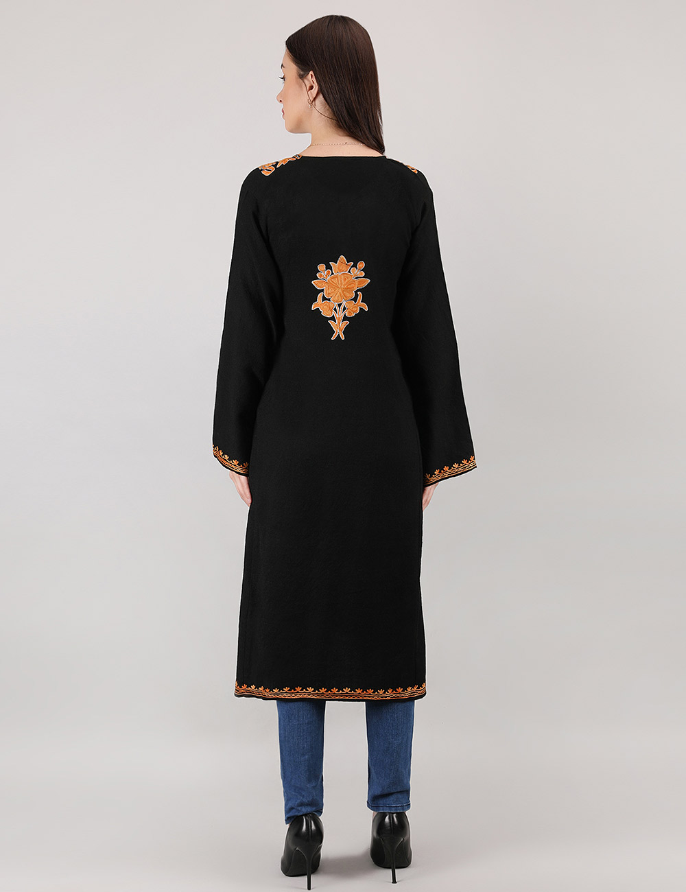 Black Wool Winter Pheran with Aari Chinar Leaf Design