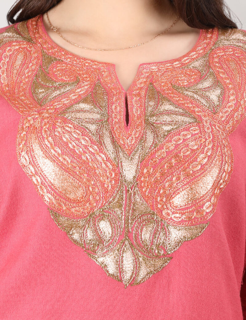 Chic Pink Wool Phiran with Intricate Tilla Embroidery