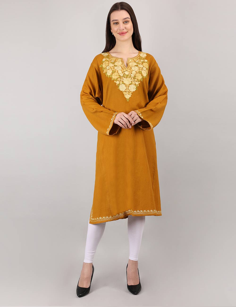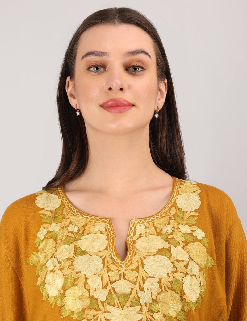 The vibrant mustard hue adds a touch of sophistication, complemented by intricate Aari embroidery—an age-old Kashmiri art form known for its delicate craftsmanship. The embroidery, showcasing floral and paisley motifs, adorns the neckline, cuffs, and hem, creating a timeless look that resonates with heritage and contemporary style.